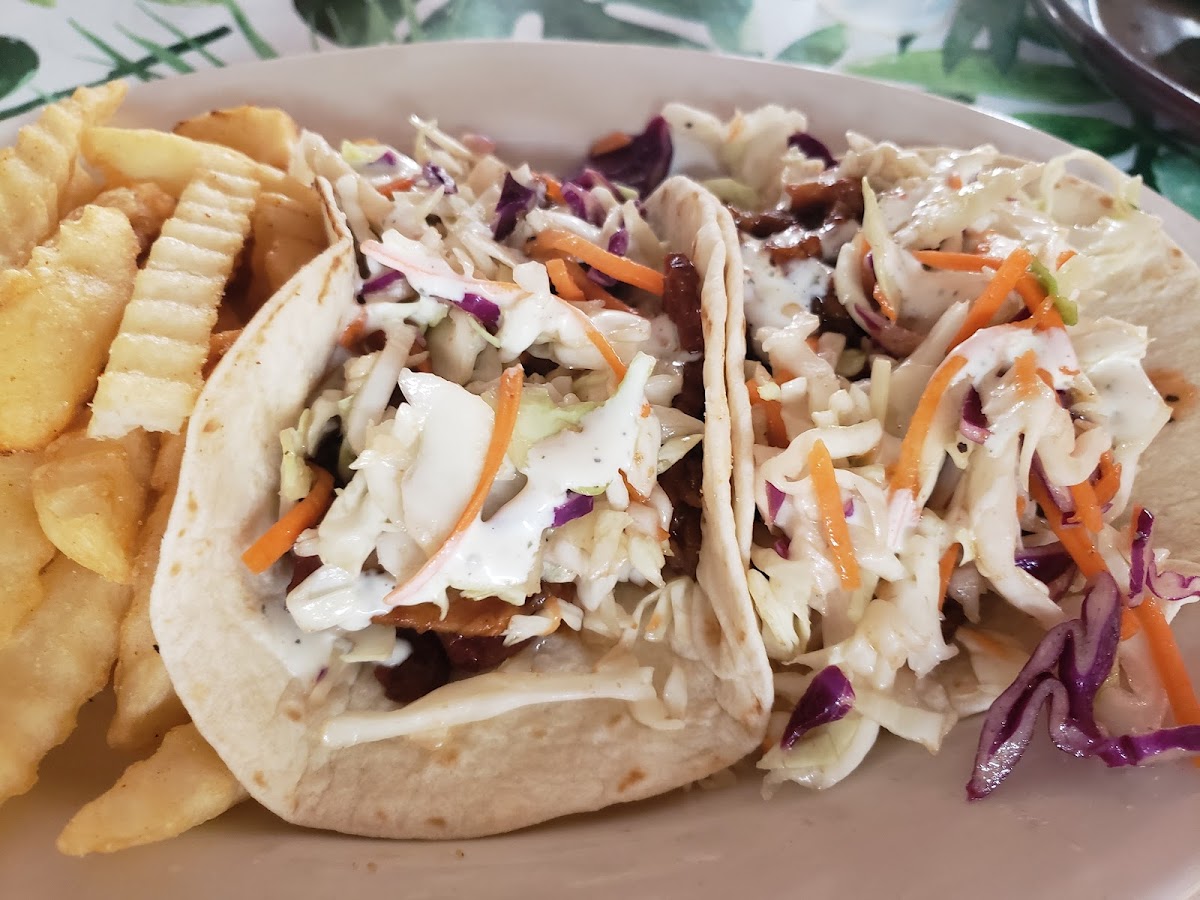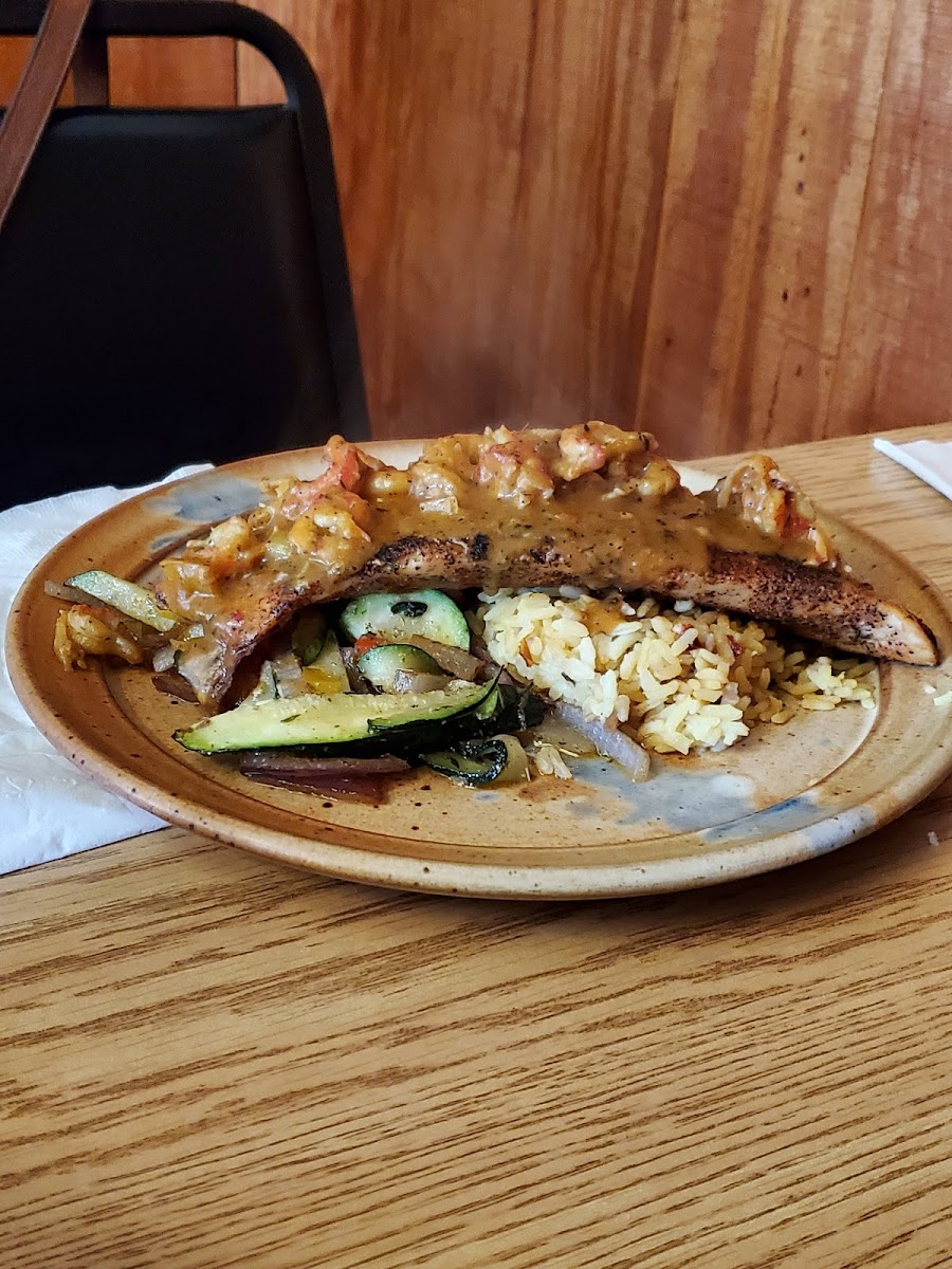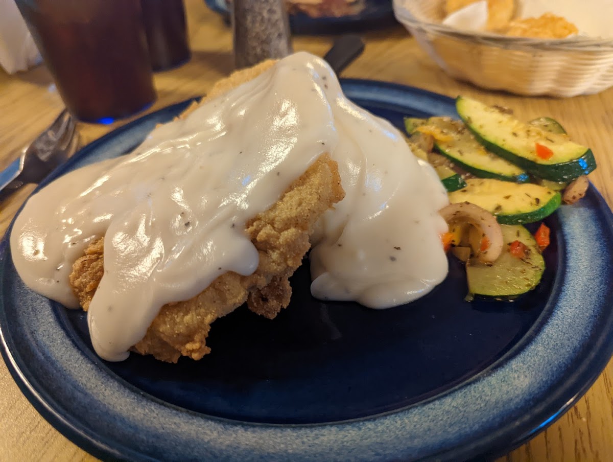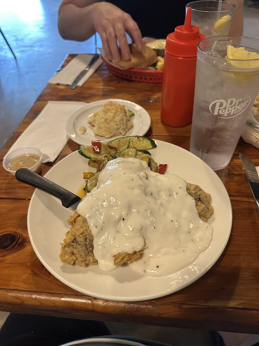 Great little place. We had the chicken fried steak and gravy and the chicken fettuccine. It was tasty and filling. They don't allow dogs inside but were kind enough to let us sit out on the front porch, with our dog, and eat dinner. The waitress was such a sweet lady. She was so good to us and you could tell she had a soft spot for dogs. We were just passing through. What a nice experience in our trip.